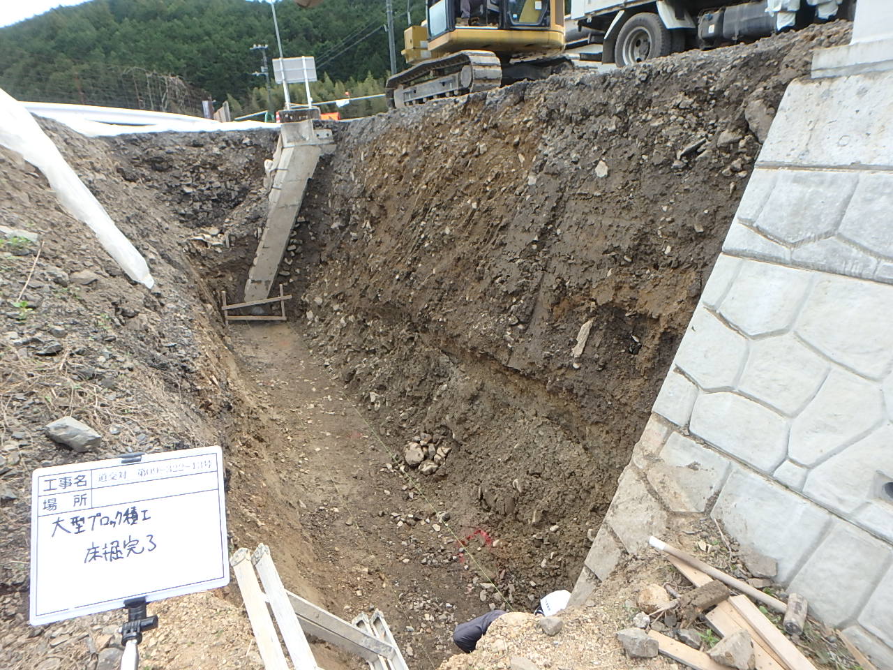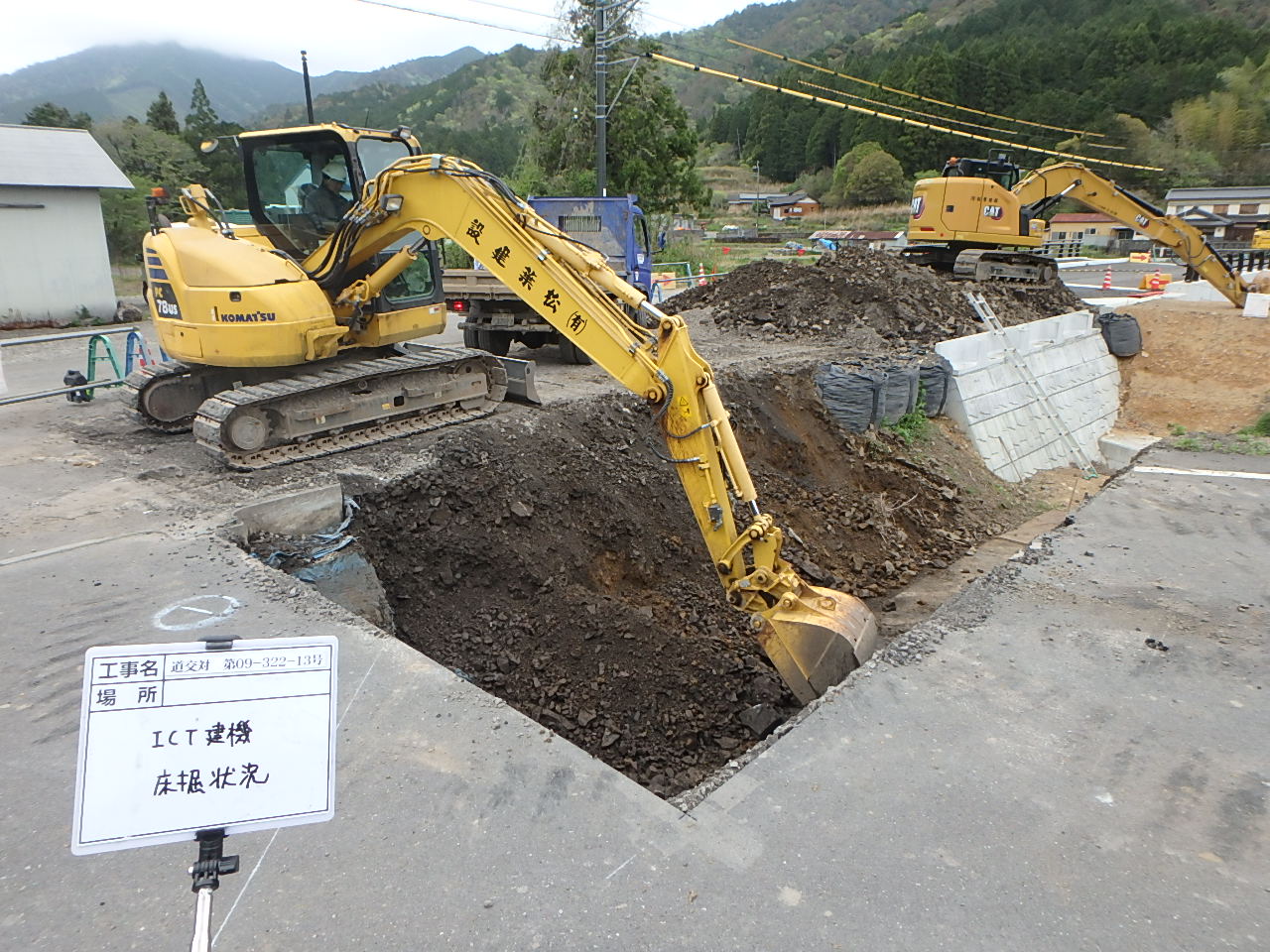 本日はICT建機による床掘工(コンクリートの擁壁を作るスペースを掘る作業)を施工しました。
