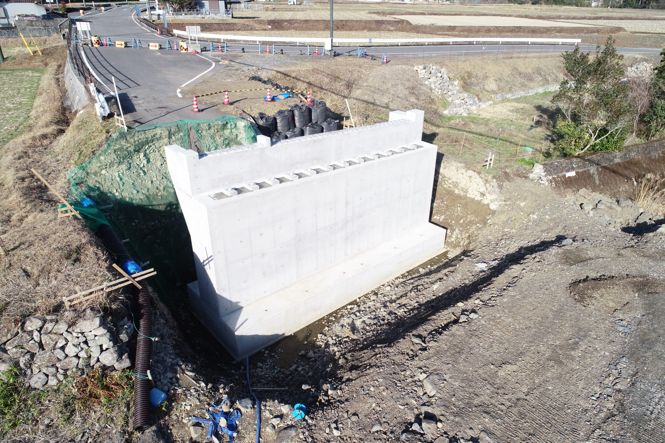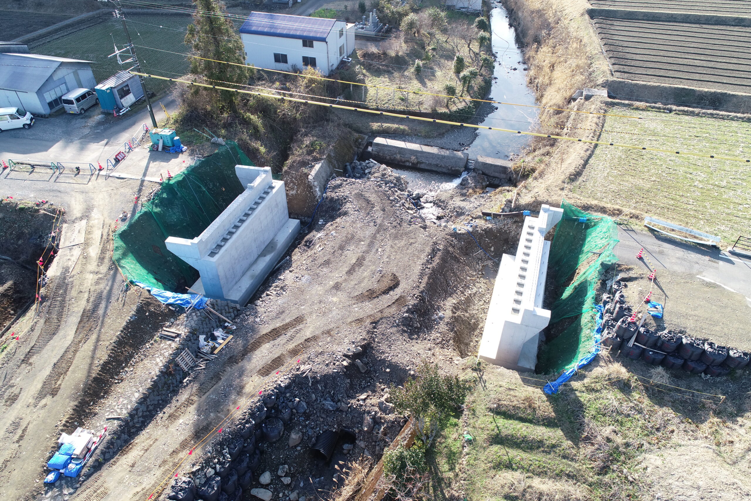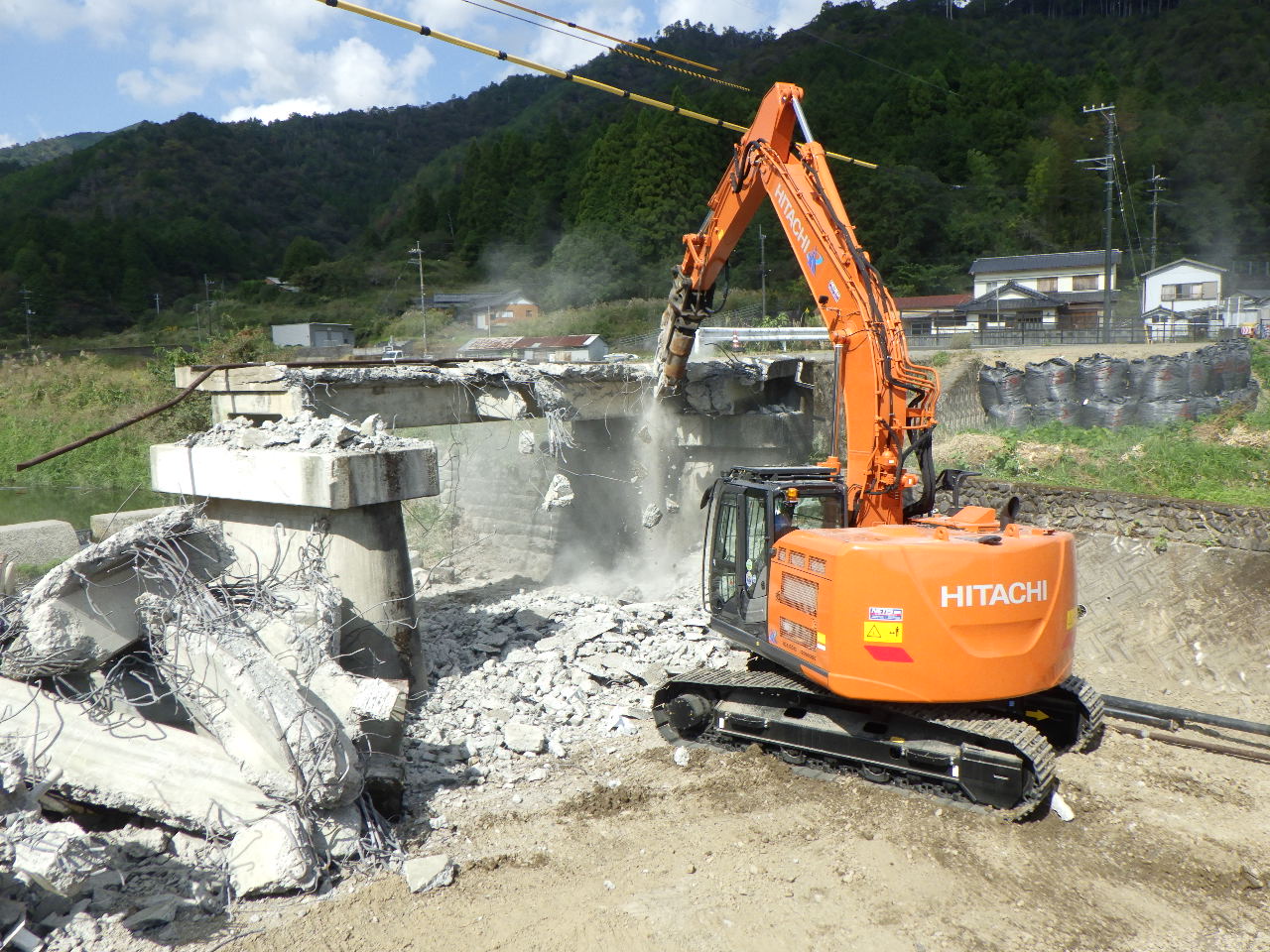 当該工事はもともと一車線の橋があったのですが二車線歩道付の橋にするための橋台(橋を架ける為の土台)と護岸工(川の水の浸食から土地を守るための壁)を作る工事です。既設の橋(上部工・下部工)の撤去の際に騒音・振動・粉塵等の悪影響が近隣住民の方へ起こる可能性が高かったので懸垂式圧縮装置と言うバックホウにハサミのような機械を取り付けてできる限り騒音等が発生しないように施工しました。