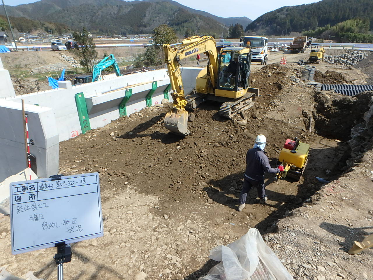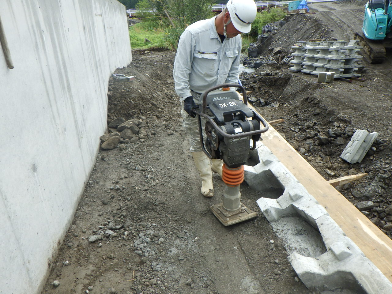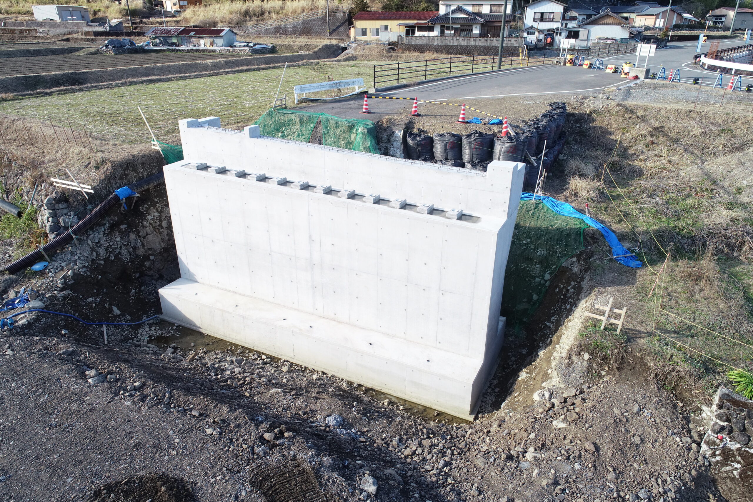 当該工事はもともと一車線の橋があったのですが二車線歩道付の橋にするための橋台(橋を架ける為の土台)と護岸工(川の水の浸食から土地を守るための壁)を作る工事です。既設の橋(上部工・下部工)の撤去の際に騒音・振動・粉塵等の悪影響が近隣住民の方へ起こる可能性が高かったので懸垂式圧縮装置と言うバックホウにハサミのような機械を取り付けてできる限り騒音等が発生しないように施工しました。