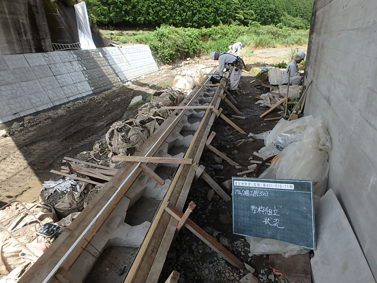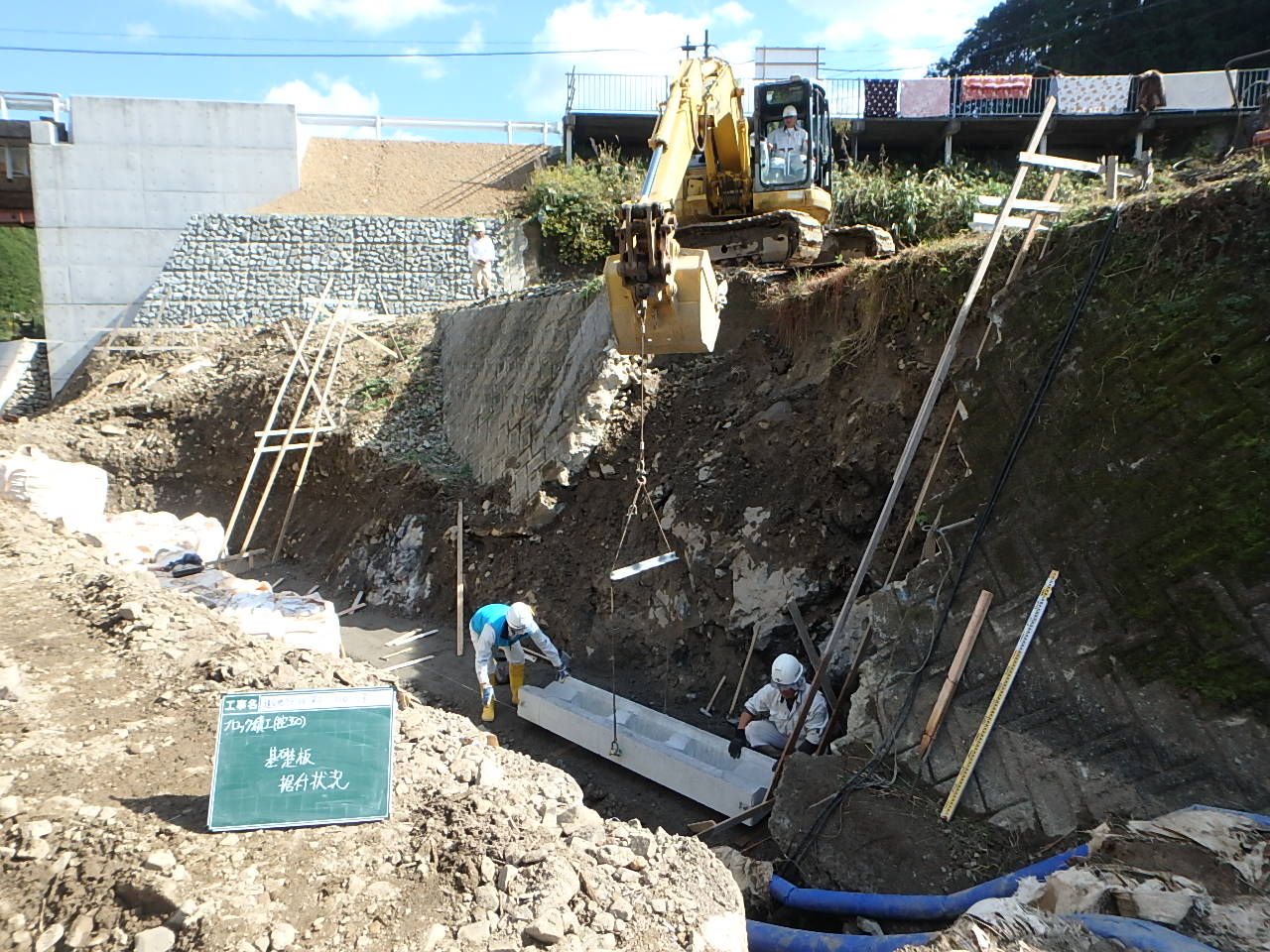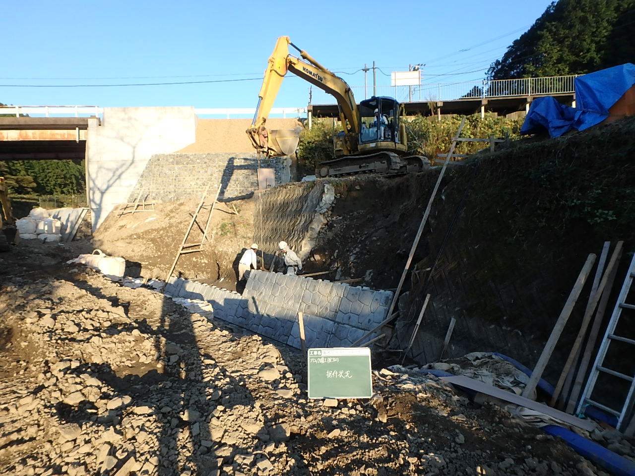 今回は引き続いて施工している橋台(橋を架ける為の土台)の周りに護岸工事(川の水の流れによる浸食から土地を守るためにコンクリート製の壁作る工事)を施工しました。